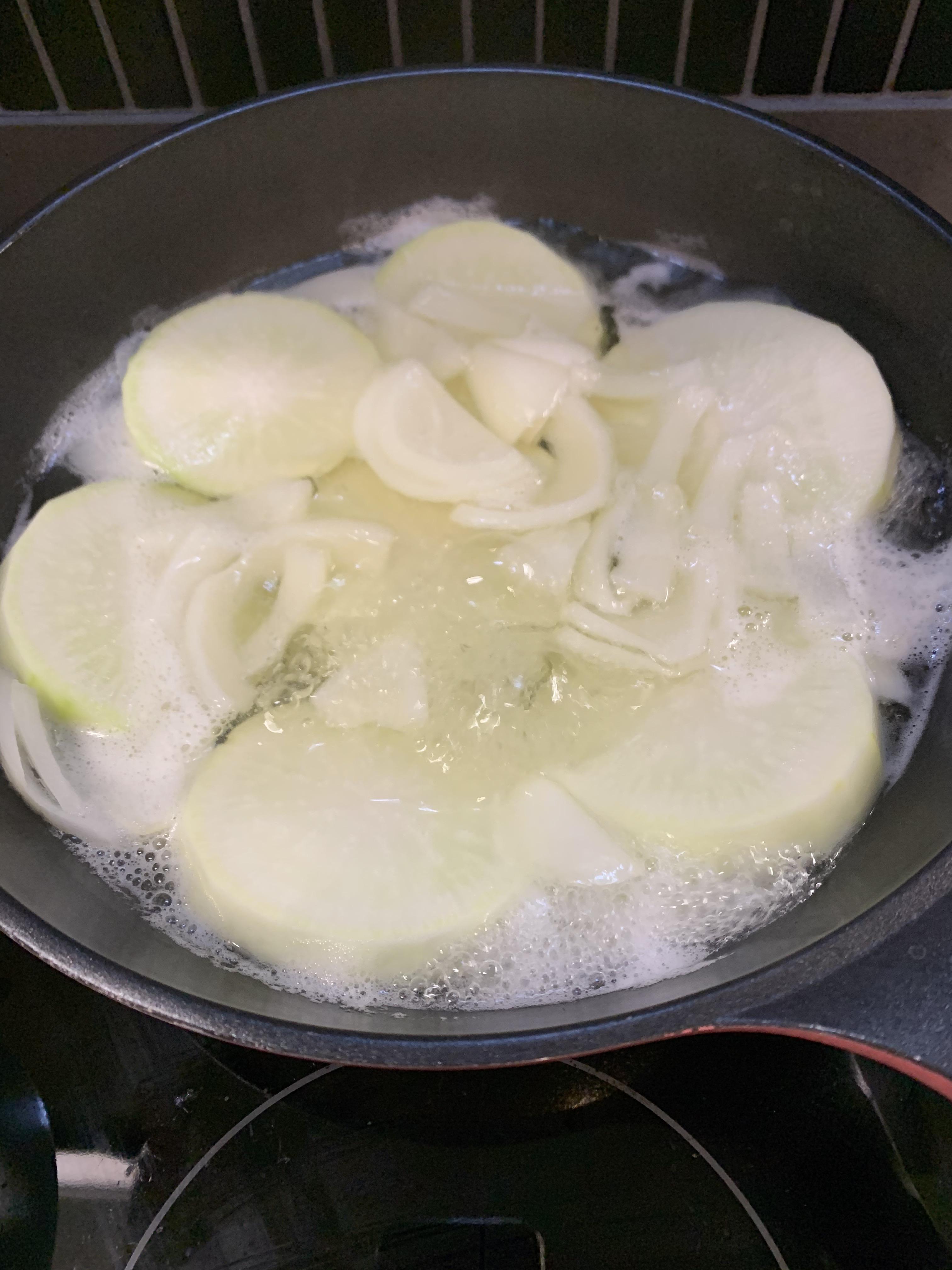 육수는 많이 안 끓여주셔도 됩니다. 무랑 양파에서도 물이 나오기 때문에 육수까지 많이 넣게 되면 갈칫국이 돼요.
