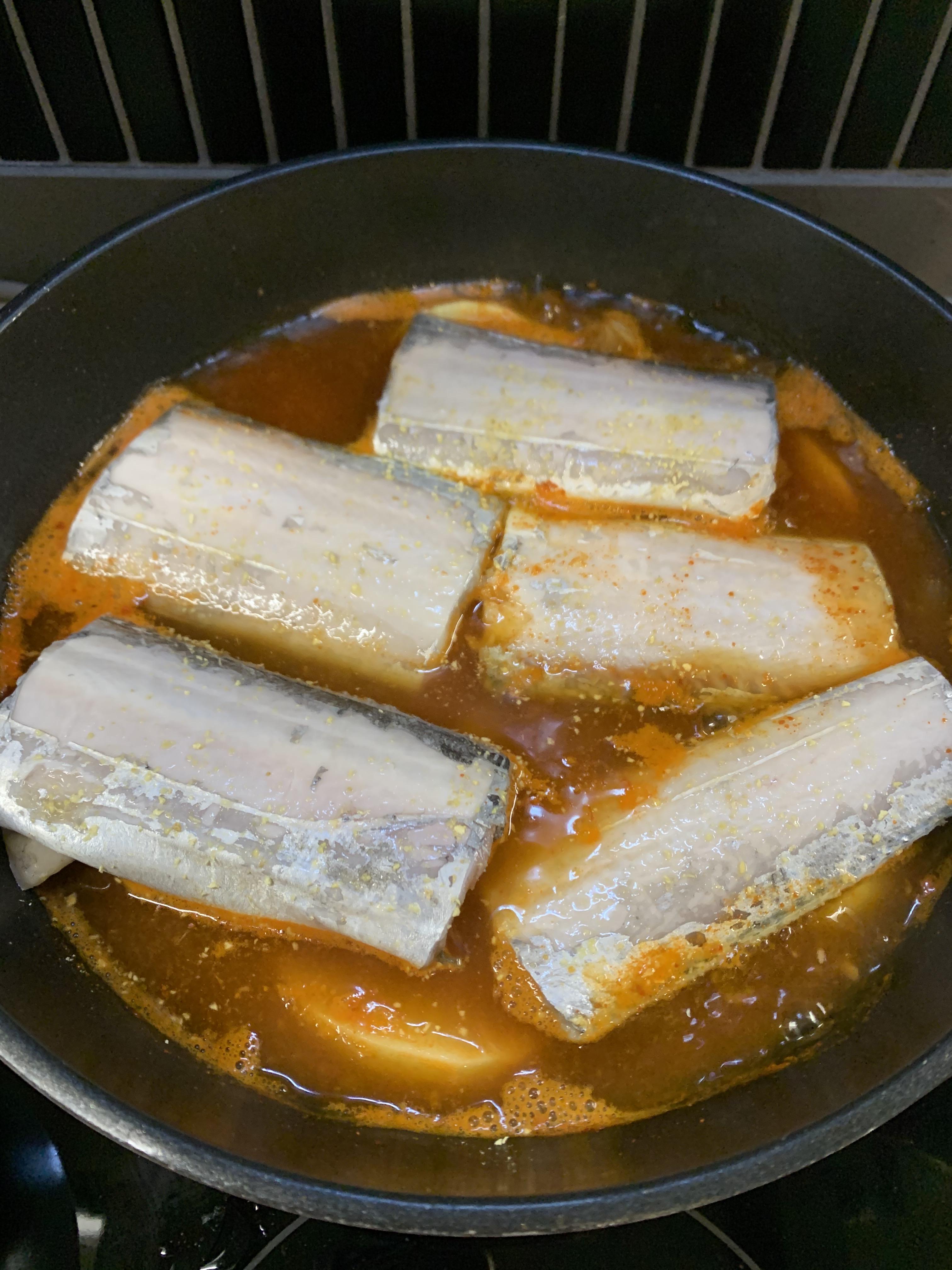 8. 무를 익히는 동안 육수가 좀 졸아서 육수를 좀 더 부어주고, 그 위에 갈치를 올려줍니다. (+생강가루 1/3큰술)